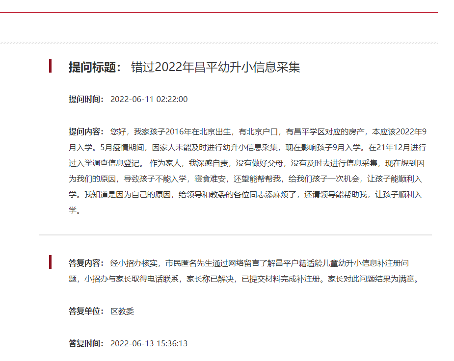 北京幼升小网团队京京老师提醒:从2022年义务教育入学政策来看,2022年错过北京幼升小信息采集补救办法没有具体说明,但京京从昌平区政府网站查找到家长咨询错过2022年昌平幼升小信息采集怎么办?据官方回复:昌平户籍适龄儿童幼升小信息补注册问题,小招办与家长取得电话联系,家长称已解决,已提交材料完成补注册。具体如下图: