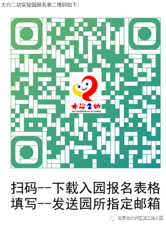 2、请您扫描下方二维码(操作方法详见《大兴二幼网上登记操作流程》),下载《2022年幼儿入园报名登记表》,如实填写各项信息,并在有效时间内将报名表以“大兴二幼实验园+幼儿姓名”命名,发送至邮箱(dxeyshiyanyuan@163.com),如您收到自动回复信息,即已发送成功,请不要重复发送邮件。