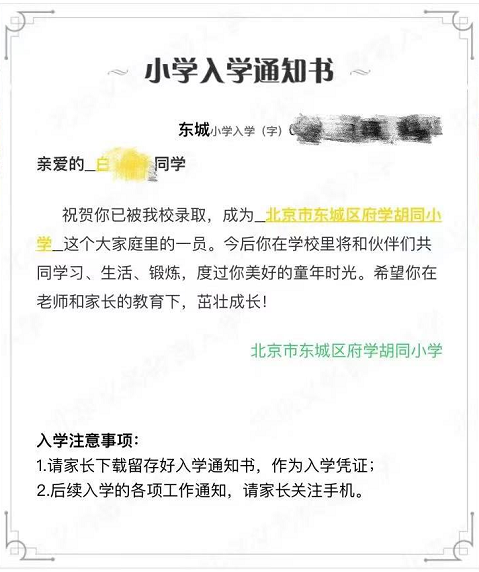 北京各区2022年小学录取通知书陆续发布,其中已有家长收到2022年东城区府学胡同小学录取通知书,北京幼升小网为您分享相关内容。
