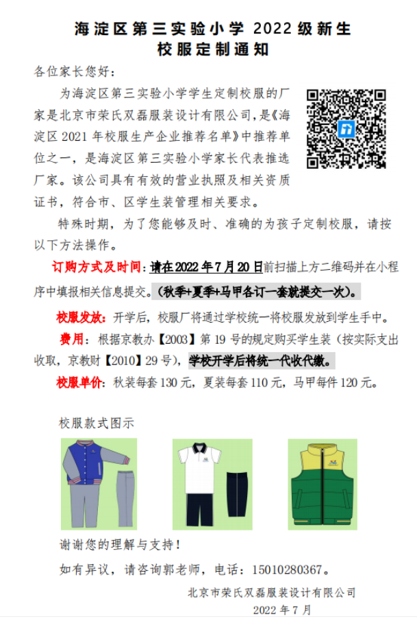 海淀区第三实验小学2022级新生校服定制通知发布,2022年海淀区第三实验小学校服定制时间和方式是什么?北京幼升小网为您分享相关内容。