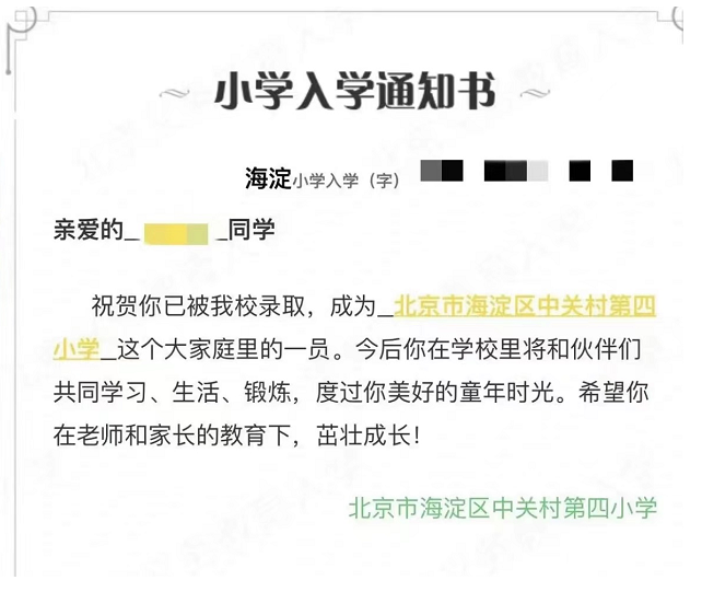 北京各区2022年小学录取通知书陆续发布,其中已有家长收到2022年海淀区中关村第四小学录取通知书,北京幼升小网为您分享相关内容。