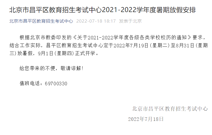 根据北京市教委印发的《关于2021-2022学年度各级各类学校校历的通知》要求,结合工作实际,昌平区教育招生考试中心定于2022年7月19日(星期二)至8月31日(星期三)放暑假,9月1日(星期四)正式开学。
