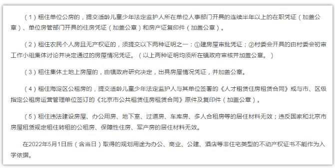 2022年海淀非本市户籍适龄儿童少年入学审核实施细则中明确指出:租住单位公房、农民个人房等需提供相关证明,如下图:
