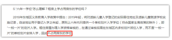 2018年东城区义务教育入学政策中提出:2019年起,将对适龄儿童入学登记的实际居住地址及适龄儿童就读学校实施记录,自该地址用于登记入学之年起,原则上六年内只提供一个单校划片入学学位(符合国家生育政策的除外),即“一校一片”的划片入学。租住房屋办理入学资格审核的,在通过审核后需在东城区内多校划片派位入学,而不是“一校一片”的单校划片安排入学,因此不占用房东的学位。