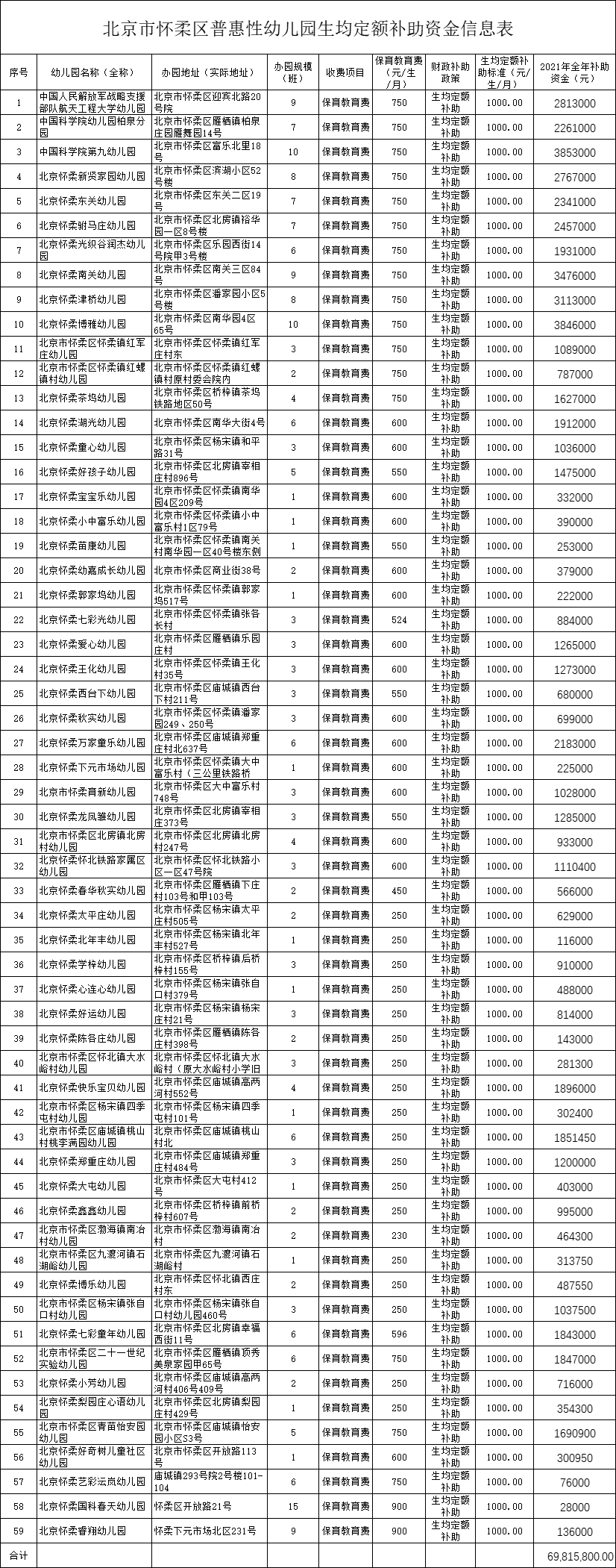 怀柔区普惠性幼儿园生均定额补助资金信息表