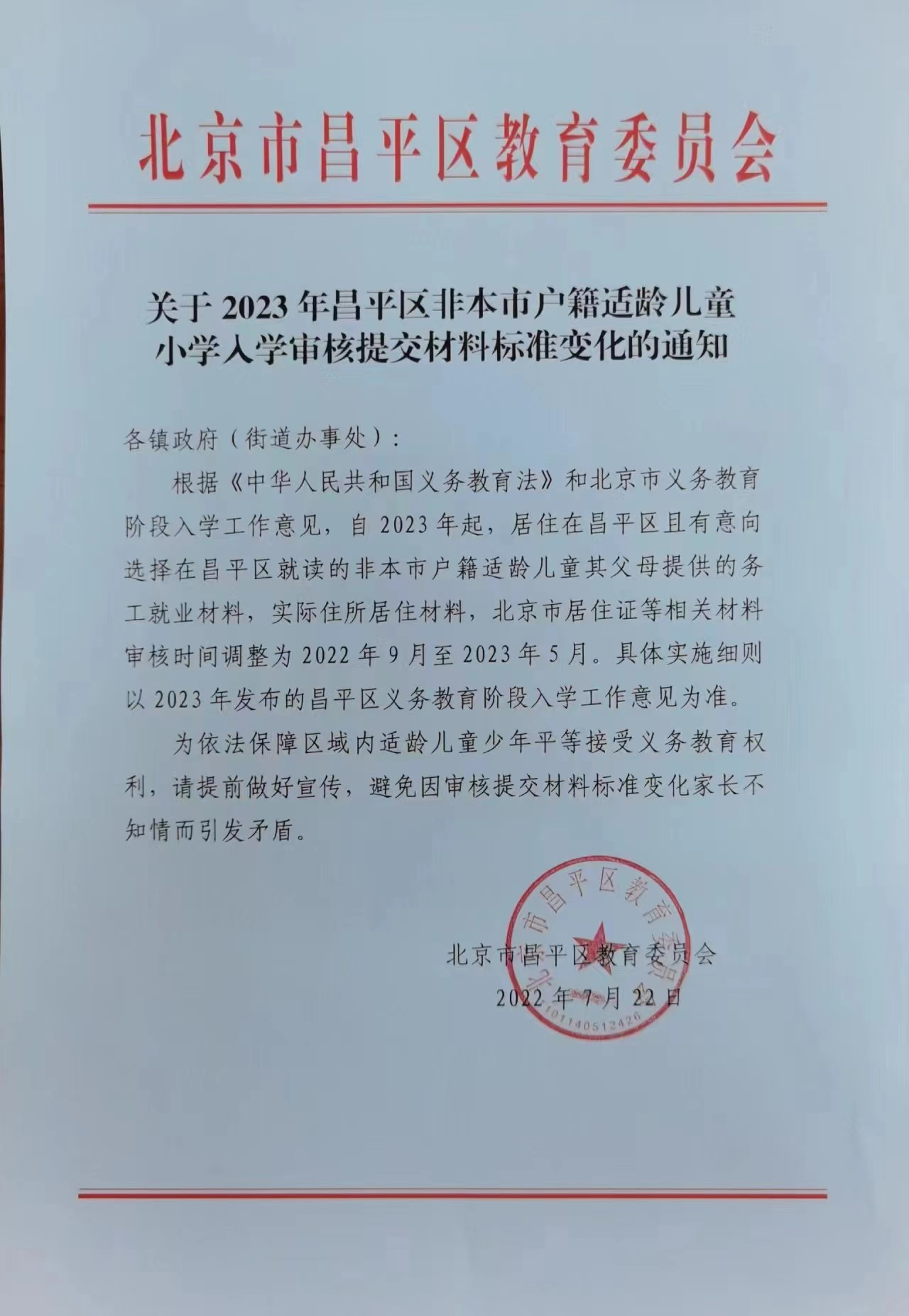 2023年昌平区非本市户籍适龄儿童小学入学审核提交材料标准变化的通知