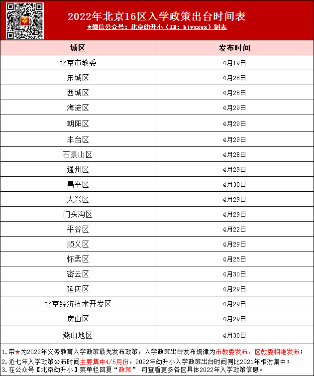 温馨提示:2023年幼升小入学政策将于明年四五月份集中发布,其中各区入学政策发布具体时间略有差异,您可参考↓2022年各区入学政策发布时间。(点击了解:北京17区2022年幼升小入学政策查询入口(幼升小政策/信息采集/小学报名))