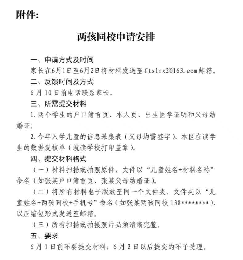 以丰台区为例,丰台区双胞胎想要申请在同一学校,需要家长在规定时间内将幼升小入学材料发送至教委指定邮箱,详详细内容请见下图:
