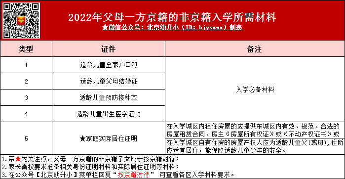 2023年幼升小父母一方为京籍子女为非京籍入学材料