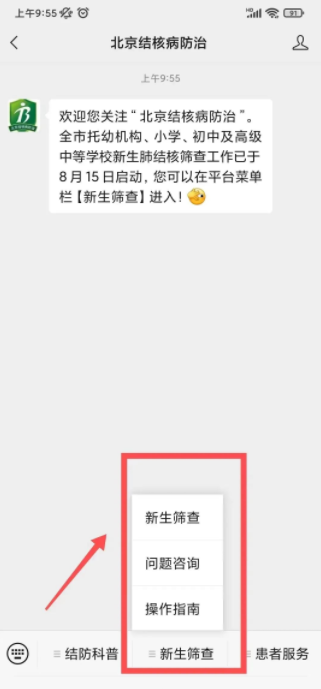 全市托幼机构、小学和初中录取新生肺结核筛查工作统一于8月15日启动,新生关注“北京结核病防治”微信公众号,在“新生筛查”栏目中完成肺结核可疑症状和密切接触史筛查。