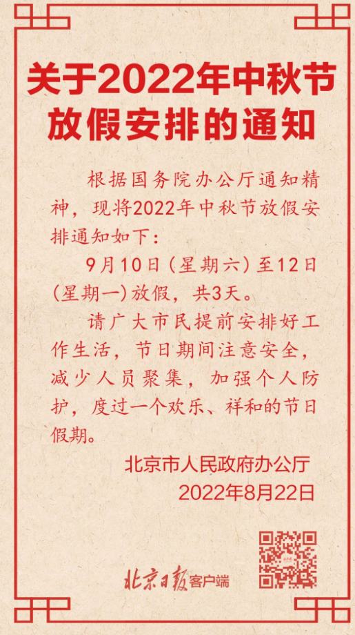2022年中秋节放假通知发布啦!9月11-12日连放三天!不调休!北京幼升小网团队为您分享相关内容。