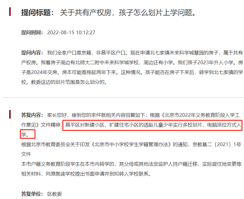根据昌平区教委答复家长疑问:昌平区对新建小区、扩建住宅小区的适龄儿童少年实行多校划片、电脑派位方式入学。