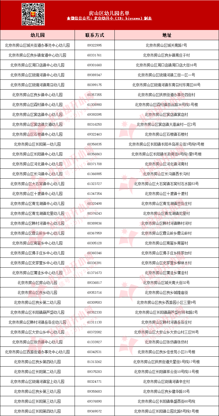 2023年幼儿园入园:房山区幼儿园名单(含学校地址及联系电话)