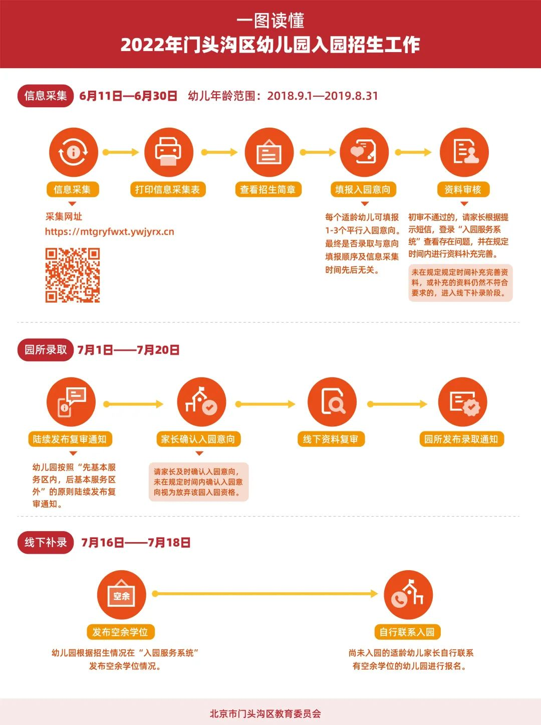 可以在7月16日—18日登录“门头沟区幼儿入园服务系统”,查看园所发布的空余学位情况,自行联系幼儿园进行线下补录。