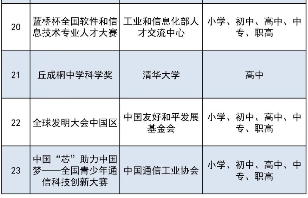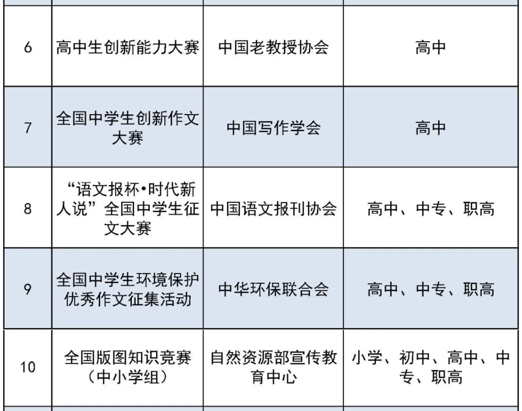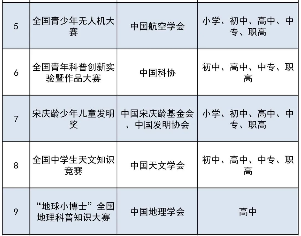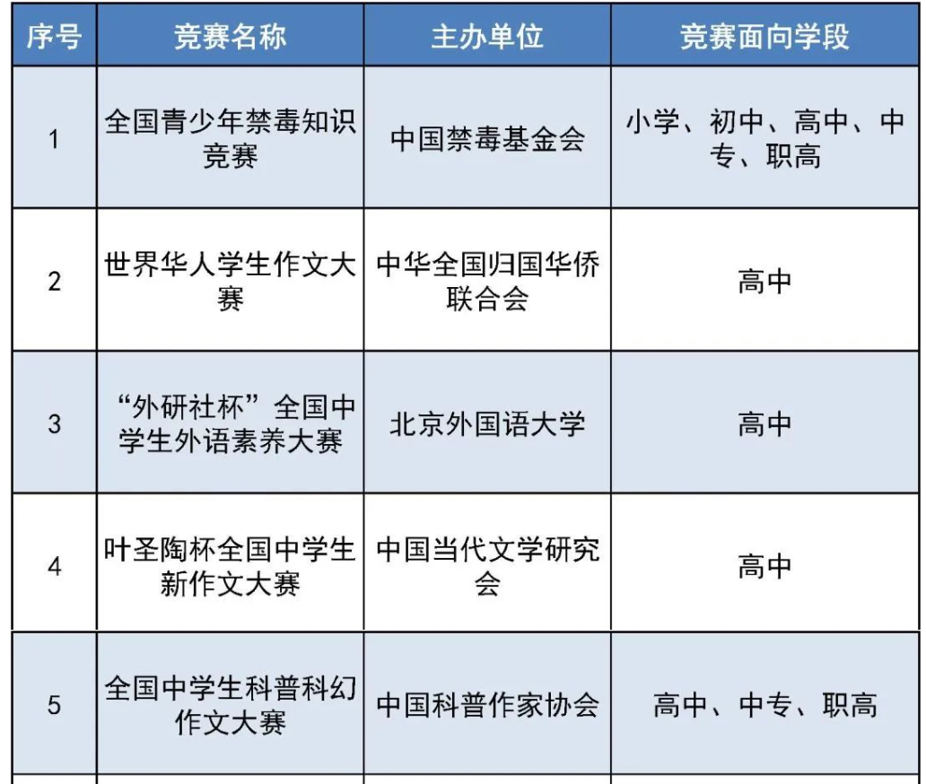 同时,2015年、2019年,教育部会同有关部门按照“促进公平、规范管理、科学精准”的原则,先后开展了两轮清理和规范高考加分工作,明确取消体育特长生、中学生奥林匹克竞赛、科技类竞赛、省级优秀学生、思想品德有突出事迹等五类全国性高考加分项目。按照这一精神,这次审批通过的竞赛均不得作为高考加分项目。