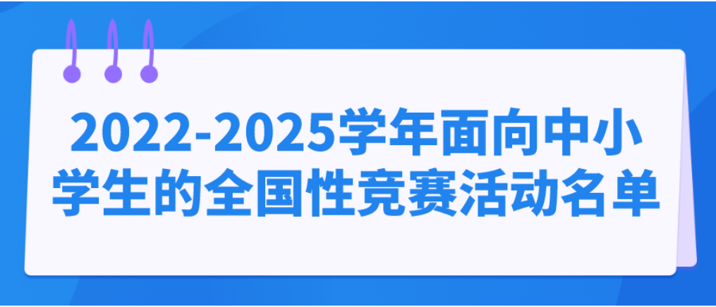 自2018年教育部制定印发《关于面向中小学生的全国性竞赛活动管理办法(试行)》以来,教育部已连续四年开展面向中小学生的全国性竞赛活动评审,并公布竞赛活动名单。今年3月,为更好满足竞赛活动管理的实际需要,教育部会同中央编办、民政部、市场监管总局对《关于面向中小学生的全国性竞赛活动管理办法(试行)》进行了完善,以四部门名义联合印发了修订后的《面向中小学生的全国性竞赛活动管理办法》(以下简称《管理办法》)。按《管理办法》要求,于今年5月启动了2022—2025学年面向中小学生的全国性竞赛活动评审工作,经主办单位自主申报、专家评审、公示和复核等程序,最终确定了《名单》并向社会公开发布。