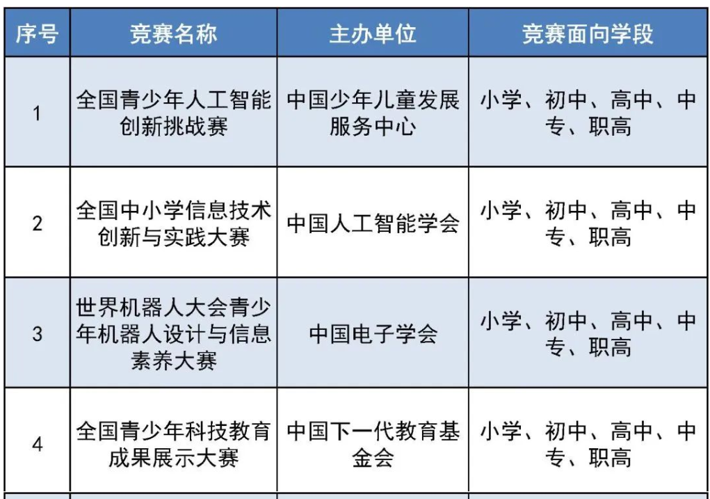 近日,教育部印发了《2022-2025学年面向中小学生的全国性竞赛活动名单》(以下简称《名单》)。全国青少年人工智能创新挑战赛、全国青少年禁毒知识竞赛、全国中小学生绘画书法作品比赛等44项竞赛活动为2022-2025学年面向中小学生的全国性竞赛活动。