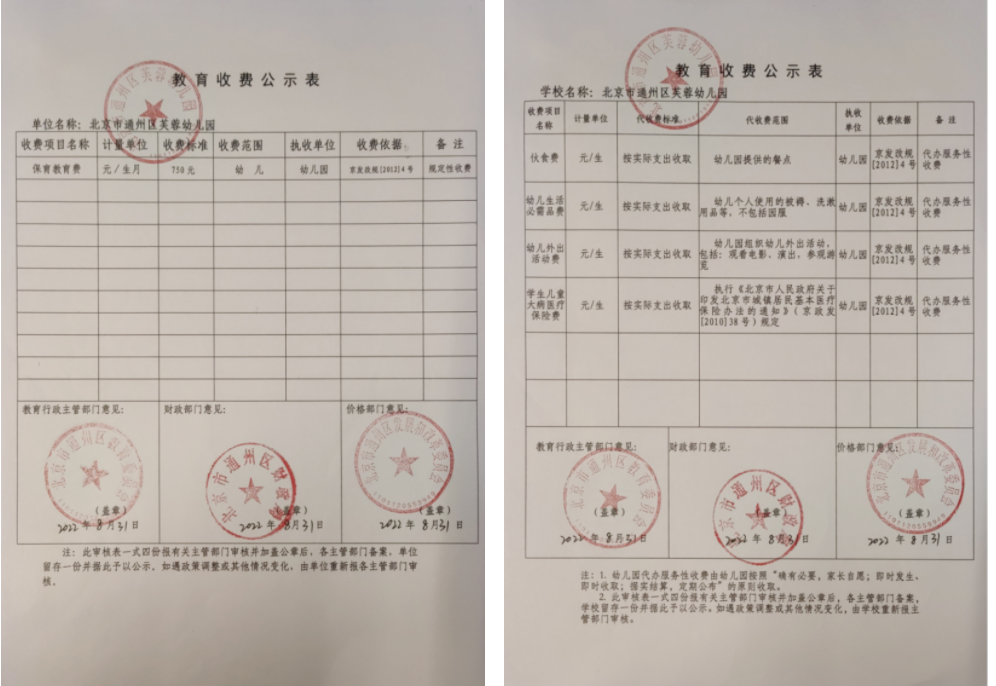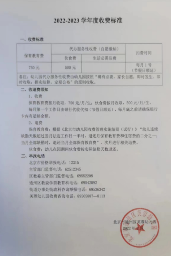 2022年通州区芙蓉幼儿园收费公示