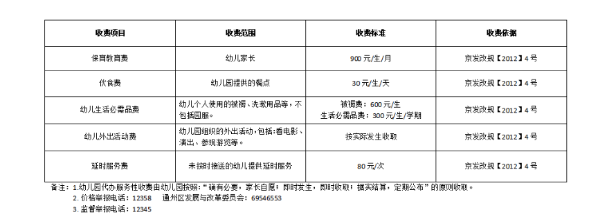 2022年北京市通州区瑞丁通大幼儿园收费公示