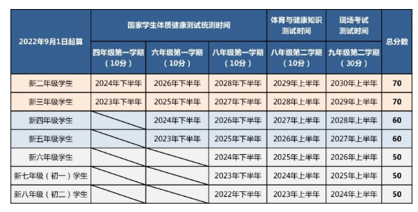 体育与健康考核评价方案分学段过渡、逐步推开。为方便不同年级的同学和家长们了解参加测试的时间,我们制作了以下表格: