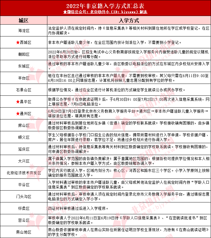 2023年幼升小政策暂未发布,参考2022年各城区要求,非京籍幼升小入学途径一般跟区教委安排派位入学,各城区具体要求可参考下图: