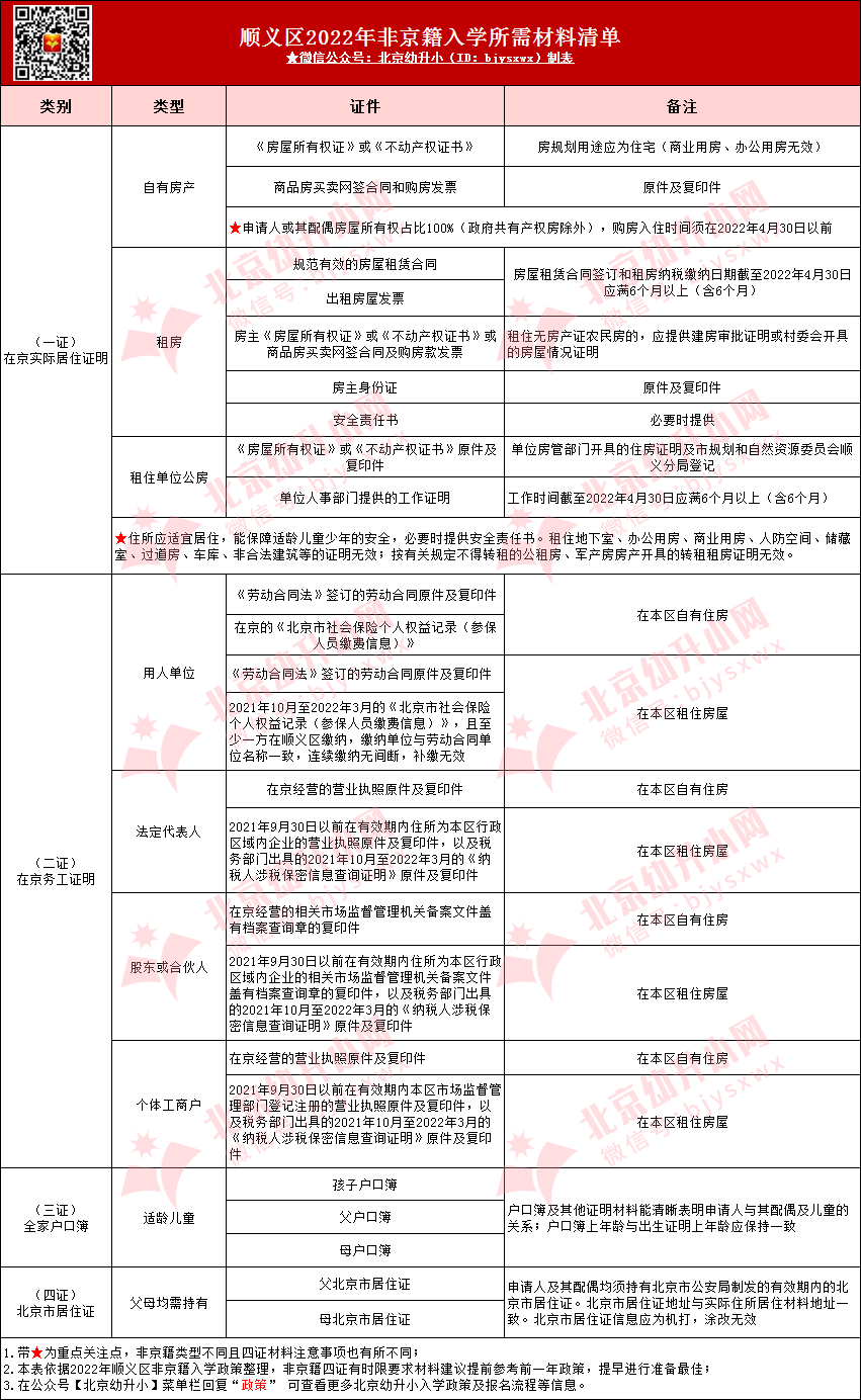 温馨提示:2023年幼升小顺义区非京籍入学政策要求将在2023年四月公布,因部分入学材料有时间、城区限制,各位家长需参考2022年政策提前筹备,详细要求如下: