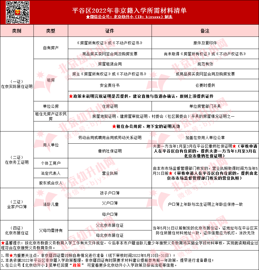 温馨提示:2023年幼升小平谷区非京籍入学政策要求将在2023年四月公布,因部分入学材料有时间、城区限制,各位家长需参考2022年政策提前筹备,详细要求如下: