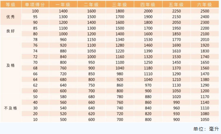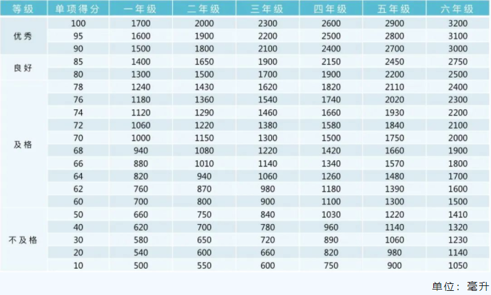 小学阶段各项目评分标准