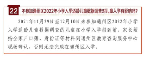 参考2022年通州区小学入学家长问答手册中,通州区未参加入学数据调查的儿童需在小学入学报到前到通州区教育咨询服务中心现场确认,否则无法完成在通州区入学。