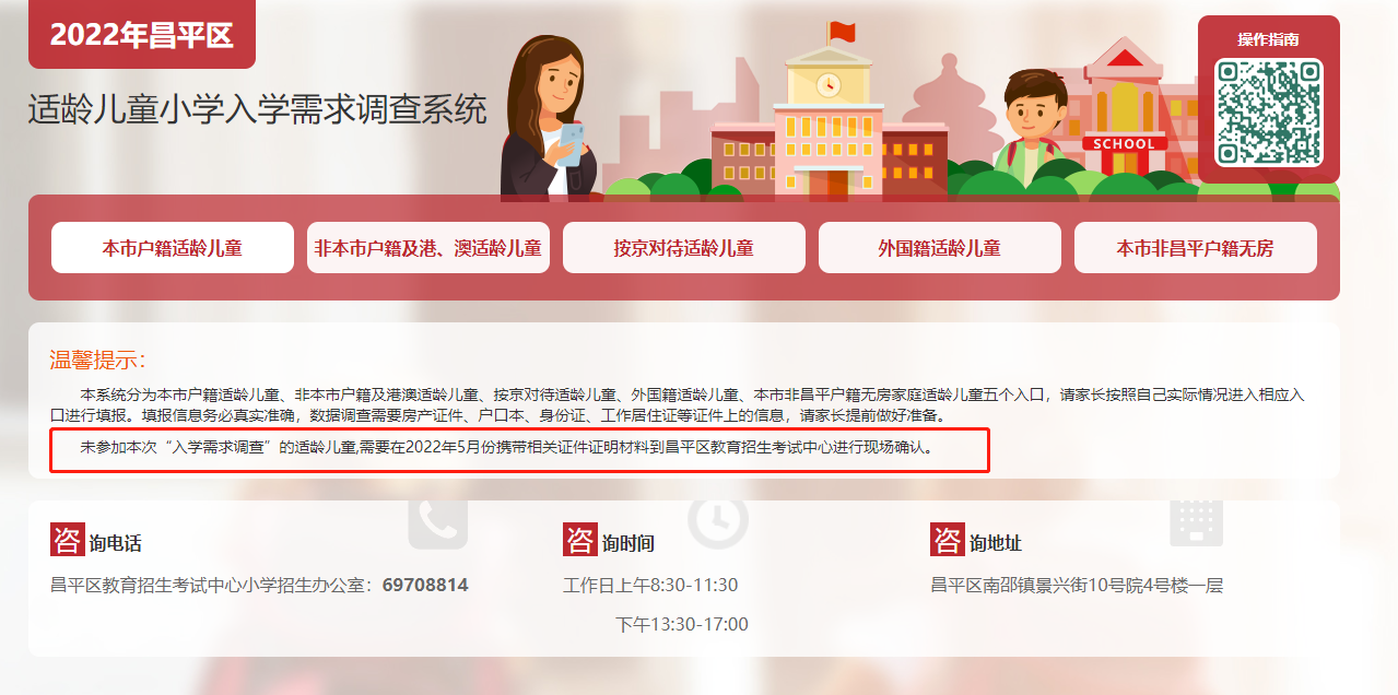昌平区入学数据调查信息将同步至小学入学服务平台,对后续报名工作事关重要。参考往年,未参加入学数据调查的适龄儿童需要在信息采集前到昌平区教育招生考试中心现场确认。