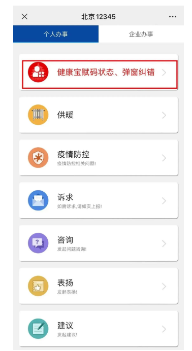 若您在京外,请通过“北京12345”微信公众号【民意直通】-【健康宝赋码状态、弹窗纠错】栏目留言(当日提交一次即可,无需重复提交)。
