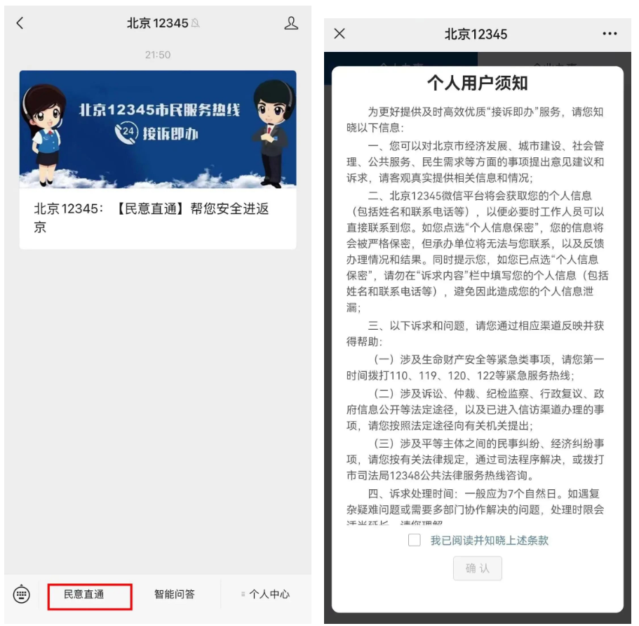 进入公众号,点击左下角【民意直通】栏,查看“个人用户须知”后,点击确认并根据您反映的问题类型选择相应的留言专区。