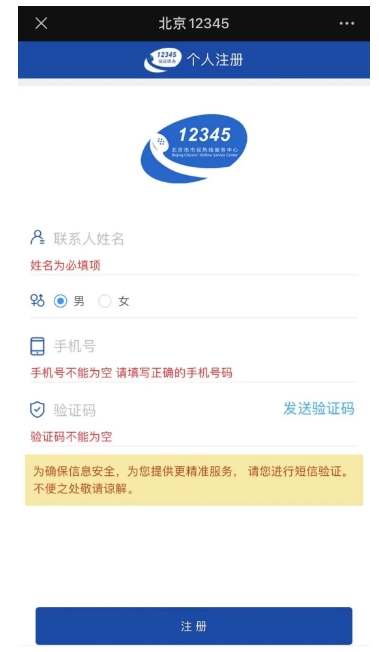 点击进入注册页面,输入姓名和正确手机号,短信验证后注册。