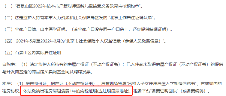 参考石景山区持北京工作居住证租房入学租房备案提醒,石景山区持北京工作居住证租房入学需要提供一年的租房完税证明: