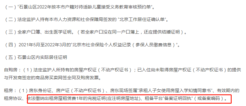 2022年石景山区按京籍对待政策中明确指出:工作居住证租房入学需缴纳1年的完税证明,并进行租房备案!