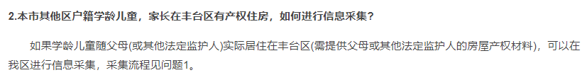 如果学龄儿童随父母(或其他法定监护人)实际居住在丰台区(需提供父母或其他法定监护人的房屋产权材料),可以在我区进行信息采集,首先确认入学登记的区为丰台区,登录“北京市义务教育入学服务平台”,选择“丰台区”,选择“小学入学服务系统”,进入“本市户籍”类型入口注册、填写详细信息。待系统审核通过后,打印信息采集表。家长可登录“丰台区招生考试中心”网站查看本市户籍儿童入学须知。