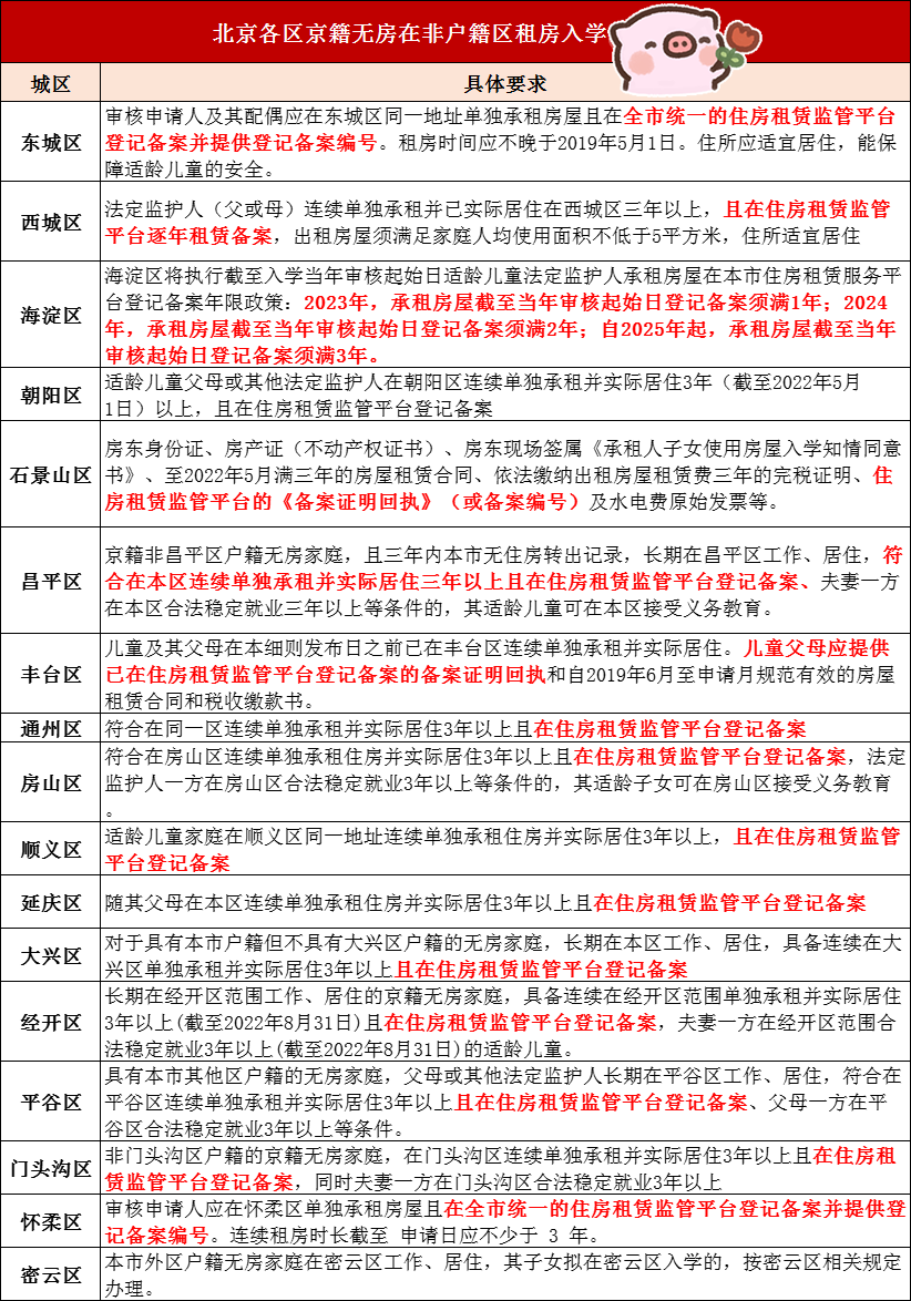 提醒:从以上表格可以看出北京各区对京籍无房在非京户籍区的租房要求主要以下几点: