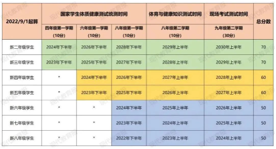 每年4至5月,区级统一组织九年级学生的体育现场考试。2022年新入八年级的学生,将于2024年上半年开始执行4类22项的现场考试方案。
