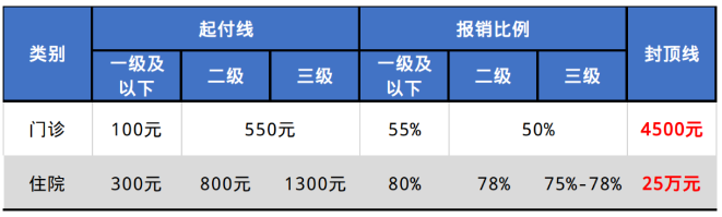 注:1.上表住院起付线是指本年度首次住院,老年人和劳动年龄内居民本年度第二次及以后住院,起付线减半。