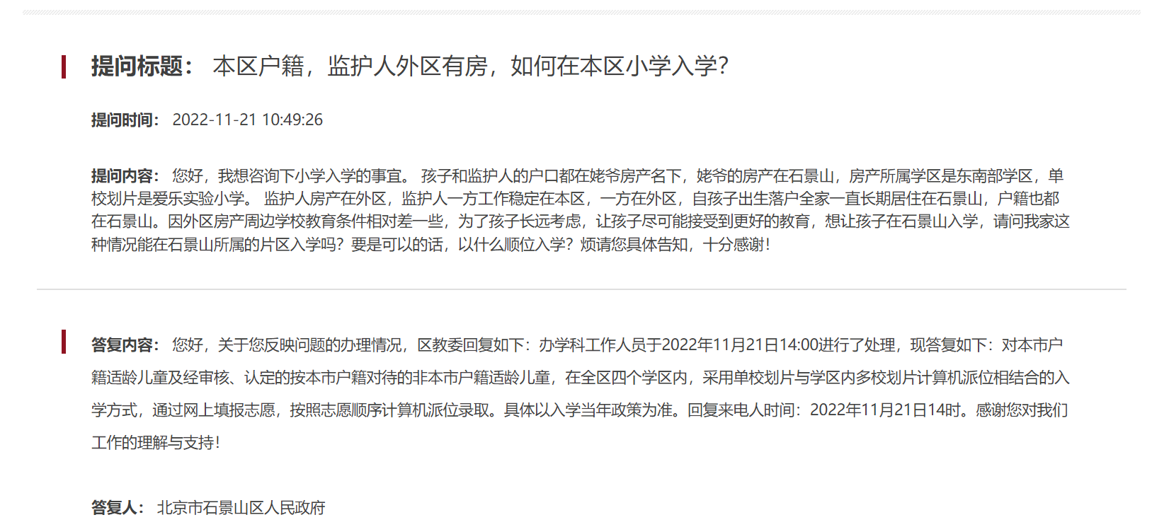 2023年幼升小石景山区户籍,监护人外区有房,如何在本区小学入学