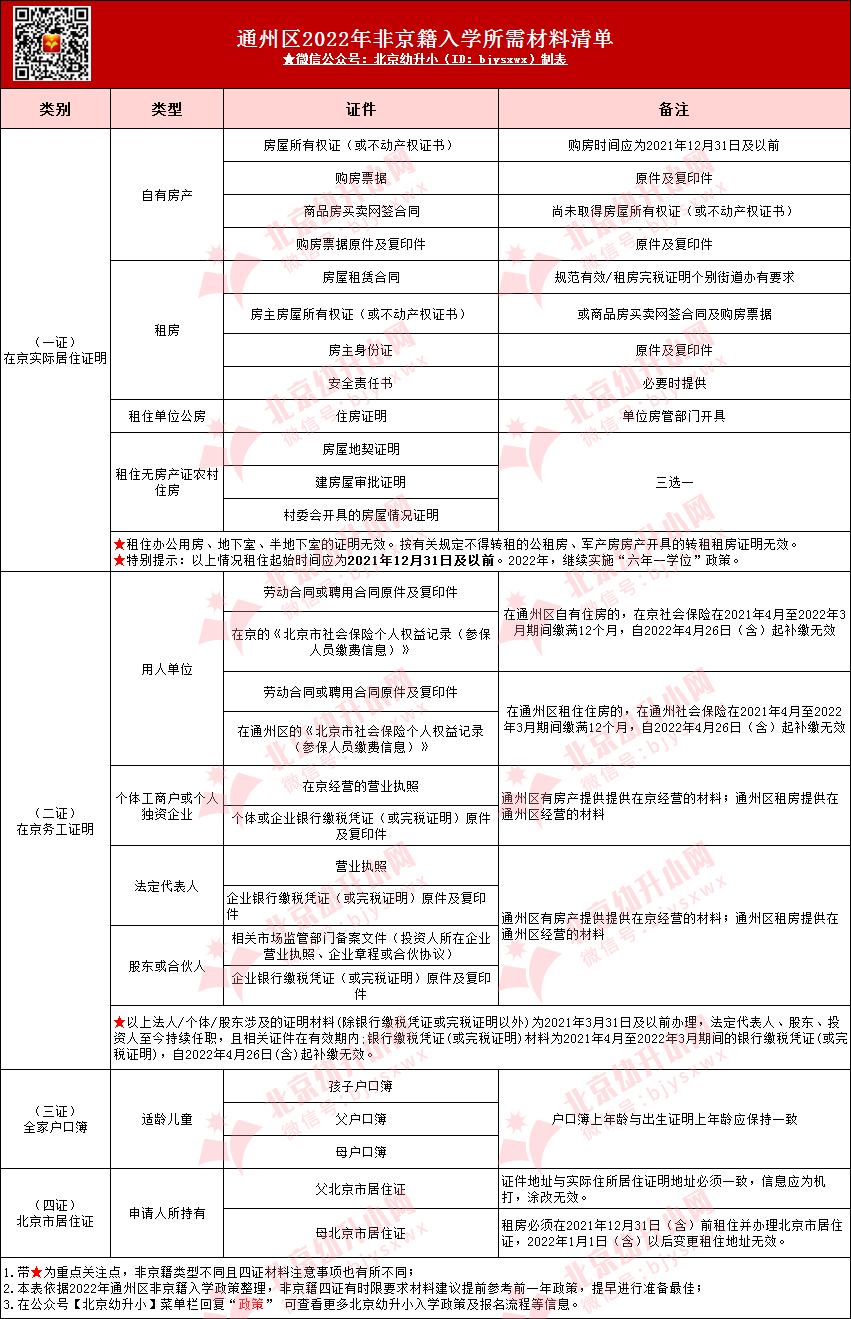 通州区非京籍需要准备四证:在京务工就业证明、在京实际居住证明、全家户口簿、北京居住证,详细材料要求请参考下图: