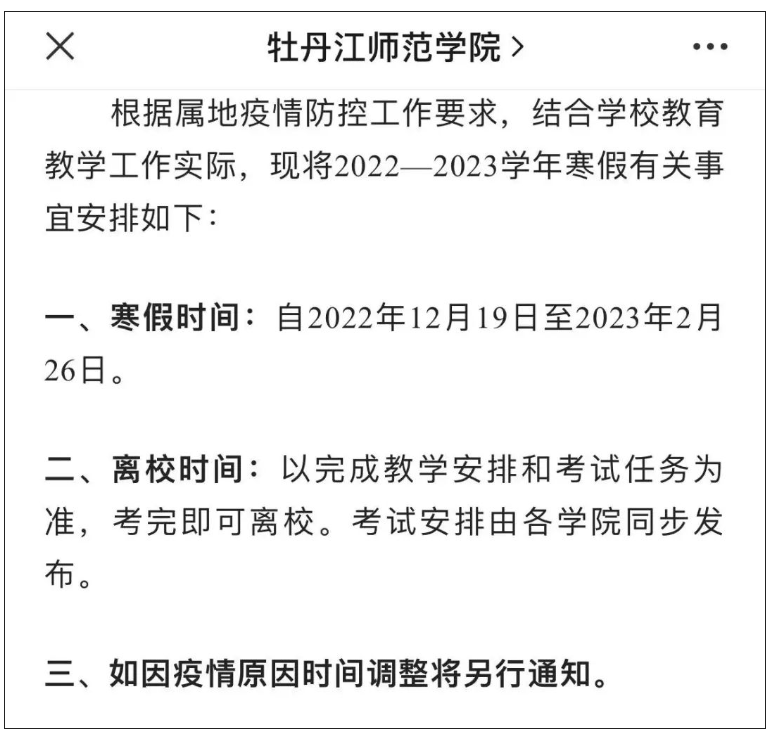 本学期教学周由原定的19个教学计划周,调整为18个教学计划周;各教学单位、各培养单位须在2022年12月30日(第18周周五)完成各项教学任务及课程考核;全体本科生和研究生于2022年12月31日前离校。