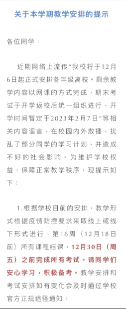 11月23日,长沙学院网站发布《关于调整2022-2023学年第一学期校历教学安排及寒假时间的通知》,对教学和寒假时间进行了调整: