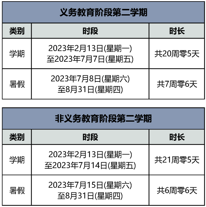 根据表中可以看出,义务教育阶段第一学期寒假是从2023年1月7日(星期六)-2月12日(星期日),共计5周零2天;非义务教育阶段第一学期寒假放假时间为:2023年1月14日(星期六)-2月12日(星期日),共计4周零2天。