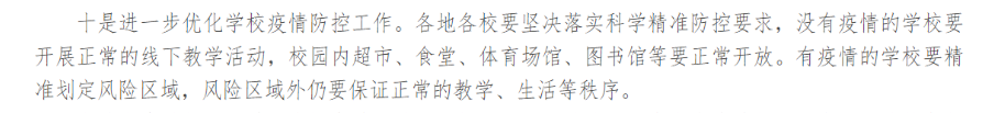 2、有疫情的学校,要科学精准划定风险区域,风险区域外仍要保证正常的教学、生活等秩序。