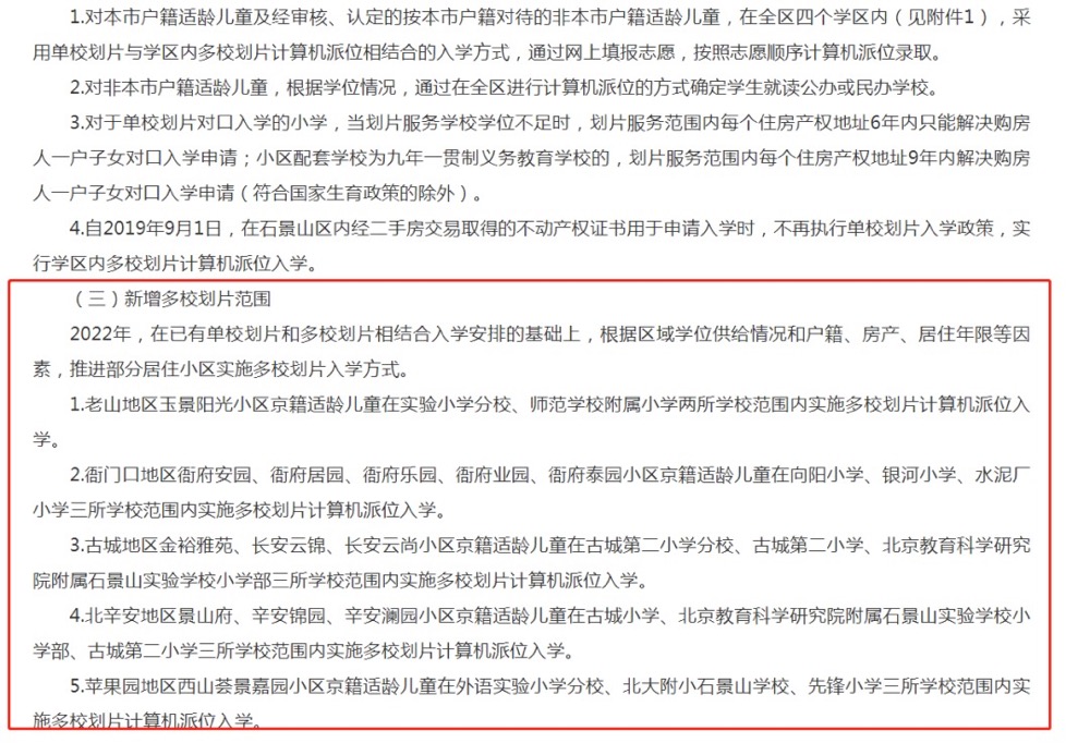 提醒:各位石景山区幼升小家长需要需注意,2019年9月1日后购买二手房的家庭,将多校划片入学,具体请以入学当年实际要求为准!另外2022年新增了多校划片范围,具体如下:
