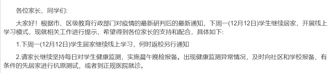 据目前学校消息了解到,多区北京中小学基本确定下周继续线上教学,海淀通知各中小学,下周暂时继续线上教学。同时要求各学校做好随时恢复线下教学的准备。