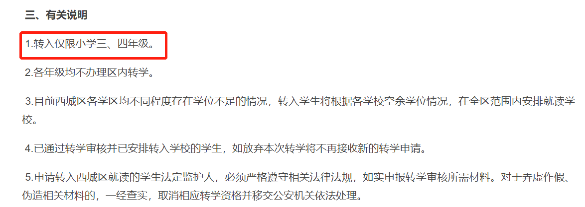 在新发布的2022-2023学年度第二学期西城区义务教育阶段公办学校接收转学申请工作安排中说明了西城区小学转学仅限三、四年级,对比2021-2022学年度第二学期西城区接收转学申请工作安排中三至五年级的要求,西城区取消了五年级的转学申请。