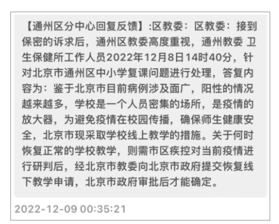 据通州家长分享:此前关于通州区中小学复课安排,根据通州区教委回复可知,如果学校想要复课,需要市区疾控对当前疫情进行研判后,经北京市教委向北京市提交恢复线下教学申请,北京市审批后才能确定,届时会有官方的通知。