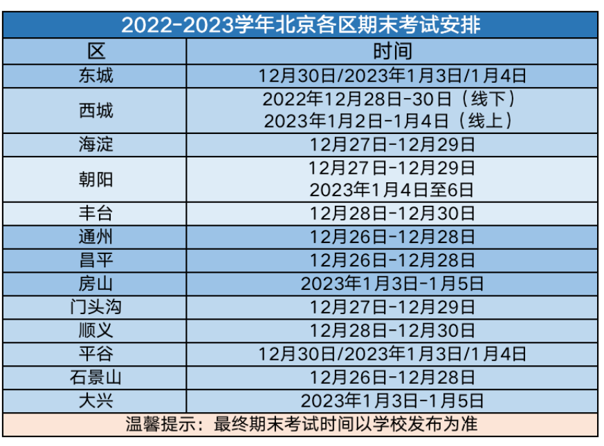 根据各校家长和学生的分享,目前北京市13区期末考试时间出炉,有的区还做好了返校复课和不能返校复课情况下的期末考试安排,其中通州区整体期末考试时间在12月26日到12月28日, 最终期末考试时间以学校发布为准。